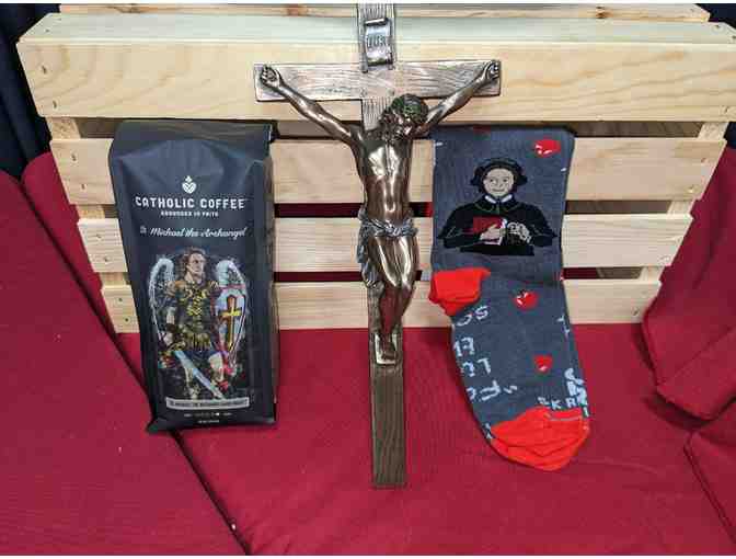Pascal Lamb Gift Pack including Michael the Archangel coffee, St Elizabeth Ann Seton socks, crucifix, and a gift card ($25).