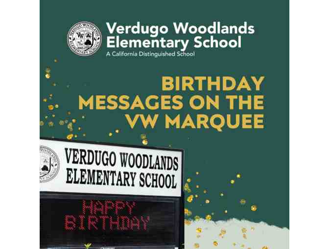 Surprise your child with a birthday wish or congratulate them on their promotion with a personalized message displayed on the Verdugo Woodlands digital marquee. ** Please provide your child's full name and birthdate or alternate display date**