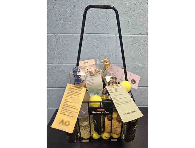 Donated by the Boys Tennis Team, this basket consists of 2 Private Lessons with Coach Denny Green (each lesson inclkuldes 1 hour use of the ball machine valued @ $100) a Tennis Ball Hopper, Main Ingredients & Recipe cards for the signature cocktails for the Four Major Tennis Championships (Grey Goose Vodka, Moet & Chardon Champagne, Pimm's No. 1 Chambord, Lemon & Lime Juice, Fever Tree Ginger Ale, Fever Tree Sparkling Lemonade, Passion Fruit Nectar, Stirrings Simple Syrup); 3 Cans US Open Official Balls, 3 Dozen Practice Balls, Sweatbands, Cocktail Napkins, Acrylic Cocktail Cups