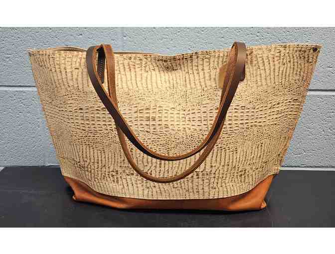Large Embossed Tote made from embossed cowhide, lined with an interior suede donated by Dominique Bags of Petoskey
