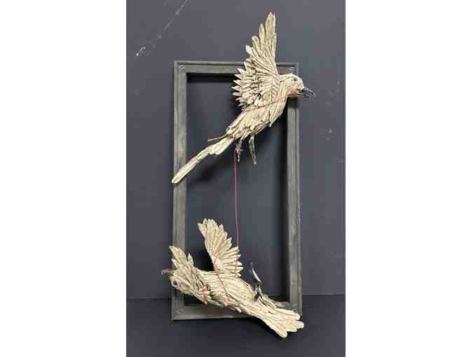 Disney II Senior Nichole Rodriguez featured this piece in her art show last year and now you can own it! Signed by the artist, this original art piece is absolutely one of a kind! The detail of this work up close is exquisite. Wooden frame. 2 birds connected.