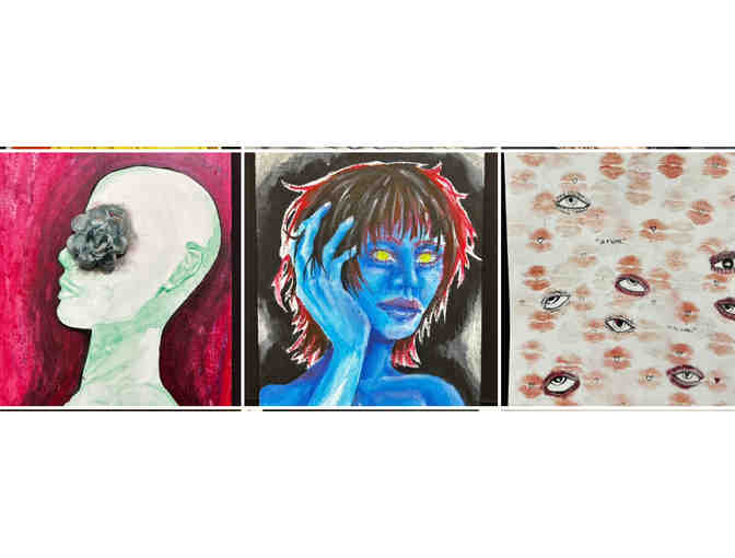 This collection of art includes three original pieces each signed by the artist. These are all original artworks by Disney II students.