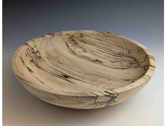 "This bowl was turned from a beautiful piece of maple that was rescued from a pile of firewood. The coloring and black striations result from an invasive fungal infection of the wood. When two different fungal species collide, they protect their colony by walling themselves off. After the tree is harvested and the wood is dried, the fungi die, leaving this beautiful figuring that is highly prized among woodworkers.