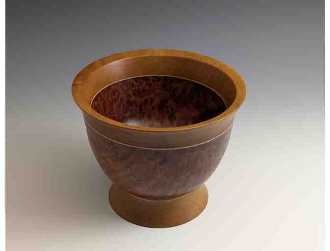"The body of this bowl is made from a red mallee burl, a formation that occurs when a tree is injured—either physically or from a viral infection. As the tree works to heal, it creates a stunning ‘scar tissue’ of swirling grain and deep color, making these burls highly prized by woodworkers.
