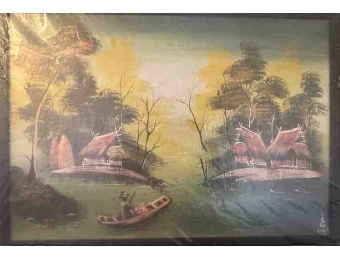 Depicting a tranquil riverside village with thatched-roof homes, lush trees, and a lone boatman drifting along the water, this piece captures the essence of peaceful rural life in stunning detail.