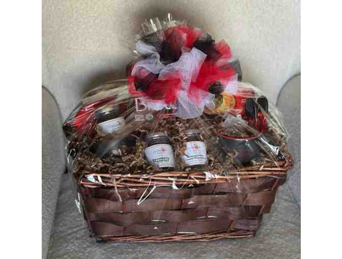 Beautiful basket which includes gourmet Jaemor Farm food items and other kitchen items donated by Brittany Purcell & Associates
