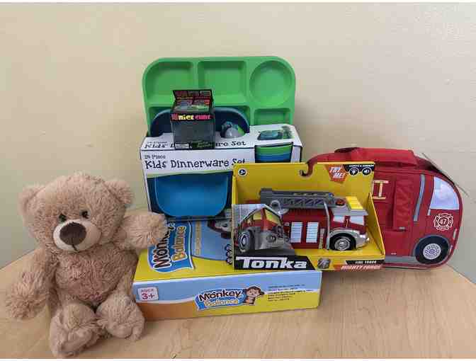A bundle of toys for a little boy including a 24 piece dinnerware set, teddy bear, fire truck lunchbox, fire truck toy, and fidget toy