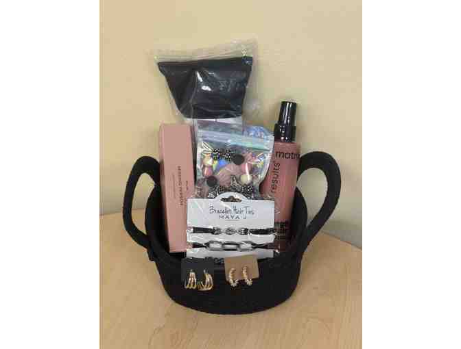 A basket full of pink and black items including black and silver hair ties, beauty and haircare items, a Foot Palace weighted eye mask, and two pairs of earrings.