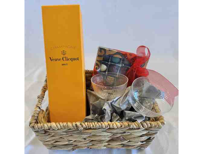 Sip in style with two elegant Crate & Barrel coupe glasses, crafted for the perfect toast. Savor the richness of artisanal truffles, each bite a decadent delight. And, of course, pop open a bottle of crisp Veuve Clicquot Champagne, bringing effervescence to any occasion.
