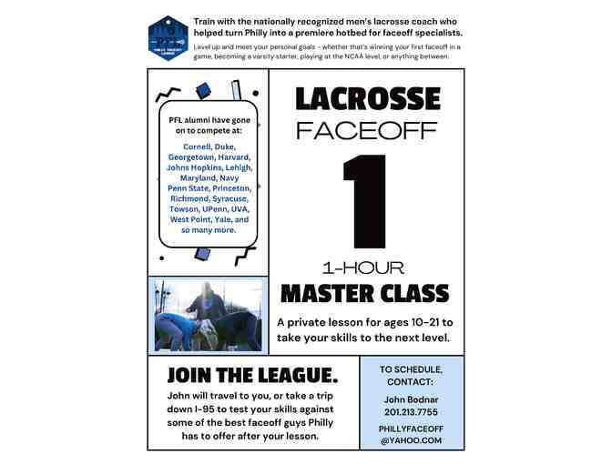- John will travel to you, or you can take a trip down I-95 to test your skills against some of the best faceoff guys Philly has to offer after your lesson