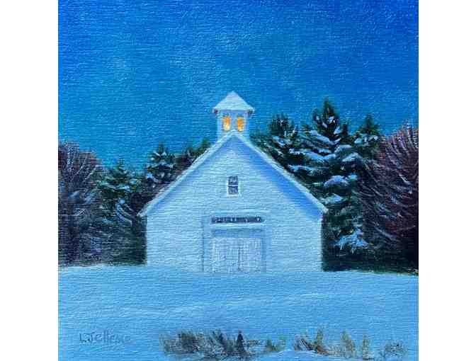 Add this ambient oil painting to your gallery. Winter Barn, Muster Field Farm, by NH artist Lisa Jelleme, measures 6" x 6" oil on board and comes framed.