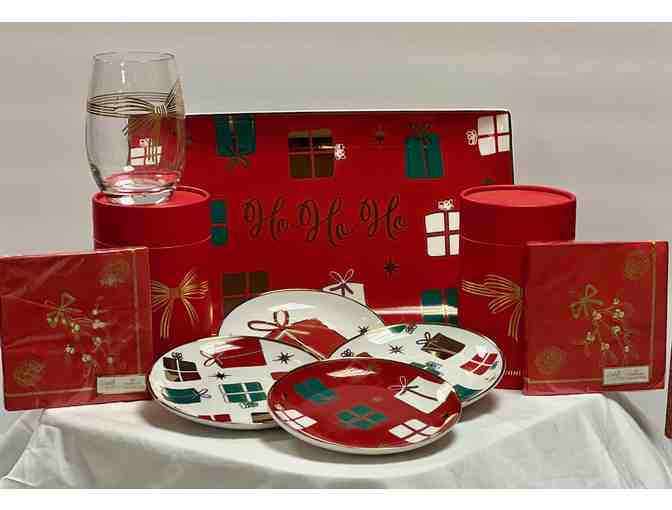 8x14 platter, Four (4) matching appetizer plates, Two (2) glass gold bow wine glasses & Two (2) packages of cocktail napkins