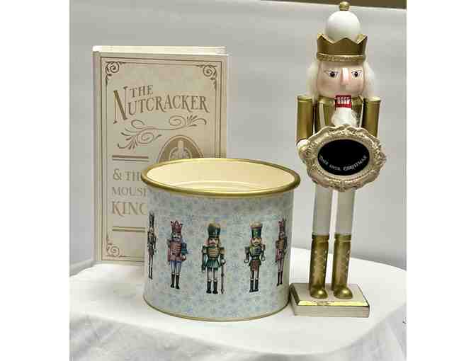 Nutcracker with Christmas countdown chalkboard, decorative Nutcracker and the mouse king box and a nutcracker table cover.