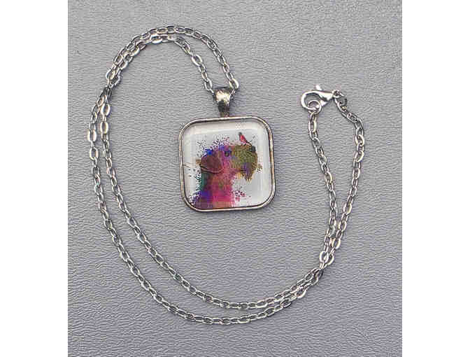 Glass cabochon necklace depicting an Airedale with a Cardinal on its nose. Cabachon is 1" x 1", necklace is 18" around.