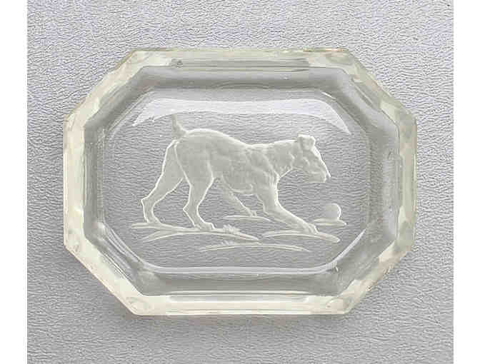 Etched clear glass Airedale and ball trinket tray. 3.25" long x 2.5" wide.