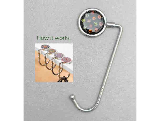 Metal table purse hook with pawprints. 4.5" long with 1.5" diameter pawprint disc.