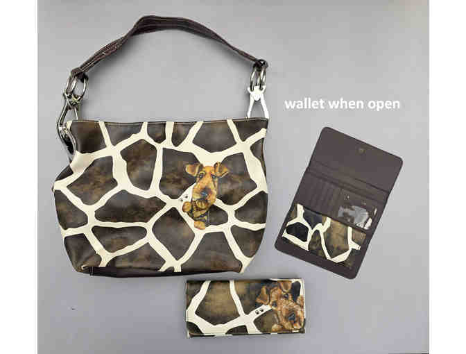 Dooney & Bourke Giraffe Print Purse with Airedale painted on one side by A. Hamilton. Pockets and zippered pouches inside. Comes with matching leopard design wallet, also with painted Airedale. Handbag 12" wide x 8" tall x 4" deep. Wallet 7.5" wide x 4" tall when folded.