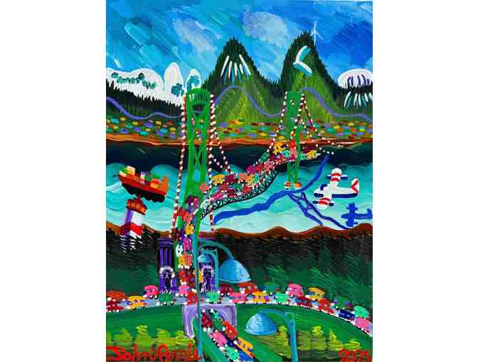 This beautiful John Ferrie piece was commissioned for Aurora's fifth anniversary, featuring vistas of the Lions Gate Bridge. For our winning bidder, the artist will work with you to add an element that's entirely your own. Add your car. Or your pet. Or yourself!