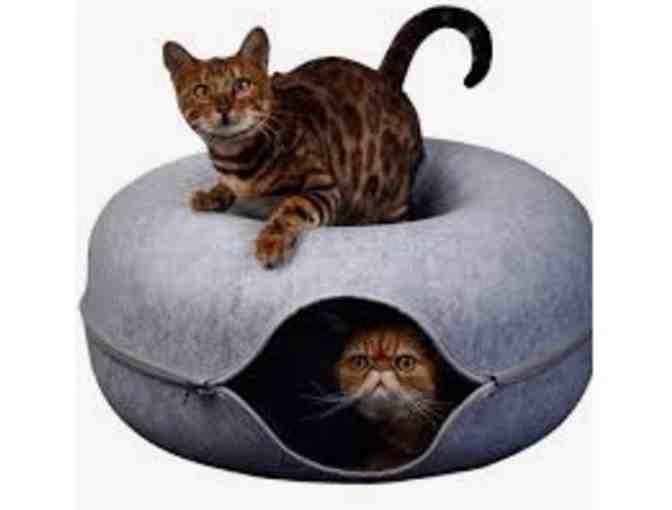 The scratch resistant felt cave can withstand even the most energetic play sessions with the most ornery of feline companions.