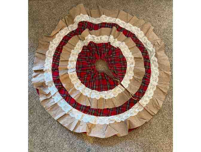 This rustic tree skirt would look pretty in any home or cabin. It is made out of burlap, lace and a Scottish plaid. It is 46” diameter and it is lined.
