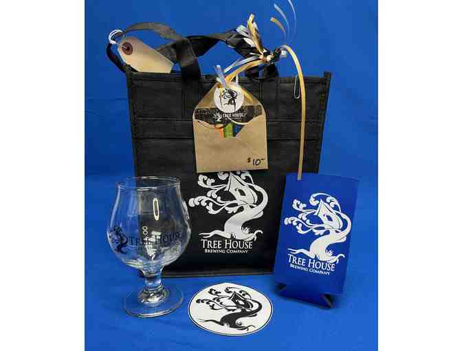 Show off your love for the fabulous Tree House Brewing Company with this branded tote bag, sticker, two koozies, and two wine glasses! This bundle also comes with a $10 gift card to the Tree House Brewing Company.