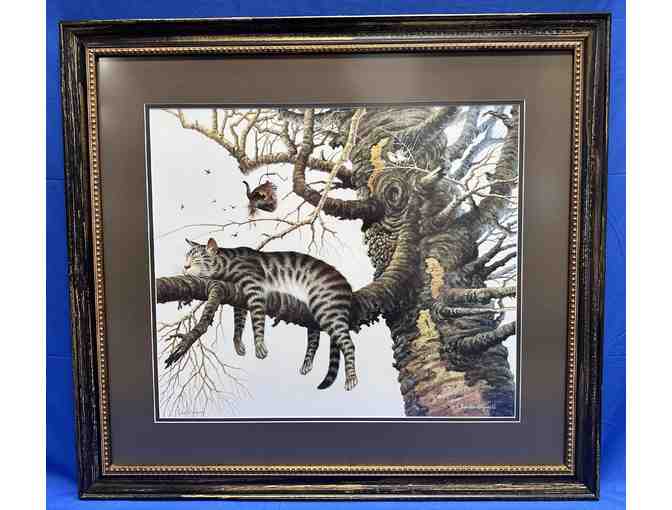 Charles Wysocki "Too Pooped to Participate" professionally matted and framed, open edition print, on paper. Wysocki perfectly captures the nature of the cat, snoozing on the limb of a tree without a care.