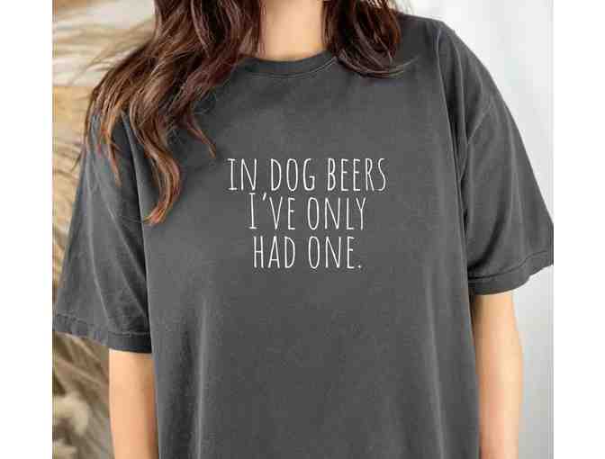 You are bidding on a gray unisex XL t-shirt made from 100% super soft, ring-spun cotton that says 'IN DOG BEERS I'VE ONLY HAD ONE'.