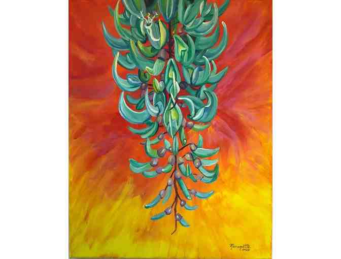 This auction item is a wonderful acrylic painting by local artist Marionette Taboniar. It depicts one of the cascading clusters of greenish-blue, claw-shaped flowers of the rare, tropical Jade Vine, which originated in the Phillipines. The cool jade flower cluster is vibrantly set off by against a hot, red-orange background, which serves to set off the beauty of the flowers. The background brushwork draws the eye to the center of the piece. This beautiful painting will stand out in your home and remind you of all the wonderful plants and flowers we enjoy here on the Garden Isle. The piece measures 11" x 14".