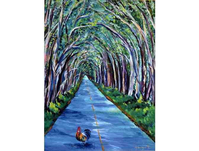 This item is a fine art print by local artist Marionette Taboniar. Anyone who has ever been to Kauai will instantly recognize the iconic Tree Tunnel along Maluhia Road, with one of our uniquitous roosters standing his ground in the middle of the highway. The cool color scheme mimics the feeling one gets driving toward Koloa, while the lazily arching and all-enveloping eucalyptus trees help guide you toward your destination. The cool shadows and muted dappling of the sunlight suggest an early morning trip. Marionette has beautifully captured a scene so well-know to all.