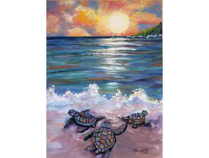 This auction item is a fine art print by local artist Marion Taboniar. It depicts a trio of baby honu (green sea turtles) who have just emerged from their beach sand nest and are racing to reach the cool, nuturing waters of the Pacific as the sun sets. The cool, shadowy waters contrast strongly against the brilliant sun and warm clouds. The beautifully rendered scene will serve to remind everyone of the beauty that surrounds us here on the Garden Isle.