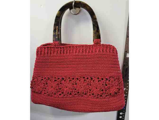 Turn heads with this Liz Claiborne red hand-knitted bag, a beautiful blend of texture, color, and timeless style. Featuring a detailed crochet design with charming floral accents and a tortoiseshell-patterned handle, this bag brings artisan flair and bold personality to any outfit.