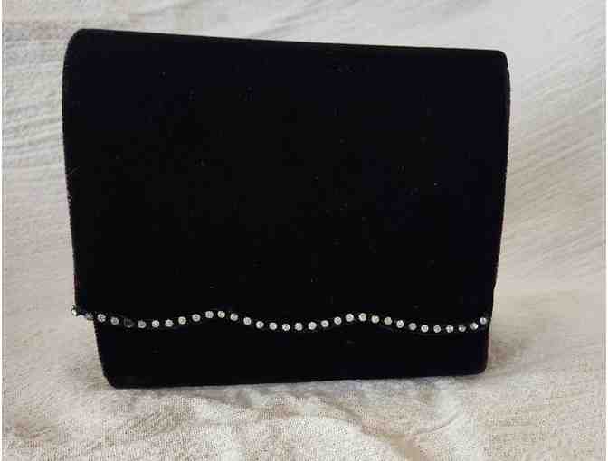 Description: This timeless black evening bag is a classic accessory for any formal or semi-formal occasion. Made from a soft, velvety material, it exudes sophistication and understated elegance. The sleek design is complemented by a delicate rope strap, making it a versatile choice for carrying by hand or wearing over the shoulder. It is missing one small crystal on the left side.