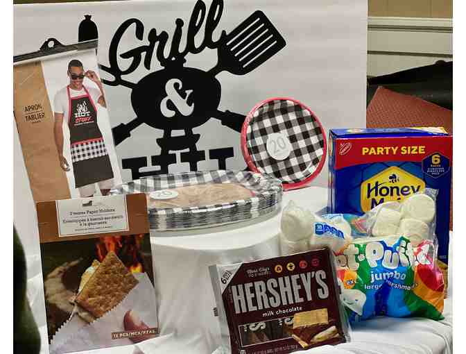 Two (2) $25 Wegmans Gift Cards, 20 piece BBQ paper plates & 20 piece dessert paper plates, a premium grill liner, storage & marinade bag, a Hot Stuff apron, a basting brush and tongs, a wood Grill & Chill sign.