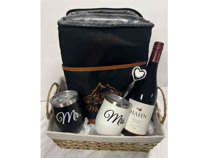 Insulated Wine Carrier, Bottle of Hahn 2023 Pinot Noir, Mr &. Mrs wine cups and corkscrew