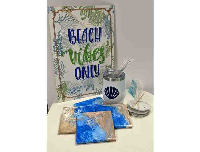 Includes: Beach vibes only sign, pack of silver dollars insulated wine glass wtih straw, cleaner &handmade wave tile coasters.
