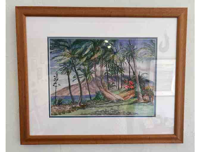 Arius Hopman’s Kihei Trades captures the luminous beauty of Maui’s southern shores with sweeping watercolor strokes and vibrant tropical hues. Towering palms sway gracefully in the warm trade winds, framing a serene view of the Pacific Ocean and the rugged silhouette of Haleakalā rising in the distance. The scene is softened by cascading bougainvillea and lush island greenery, evoking both vitality and tranquility.