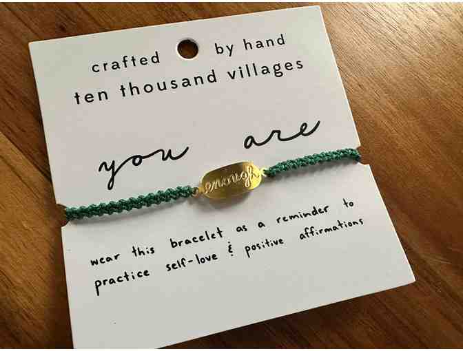 Wrap this adjustable macrame bracelet around your wrist and be reminded daily of your worth with the powerful message, "You Are Enough." This bracelet allows you to carry the affirmation everywhere as a reminder of your value and strength. This bracelet is handcrafted by women artisans with Nepal Knotcraft Centre.