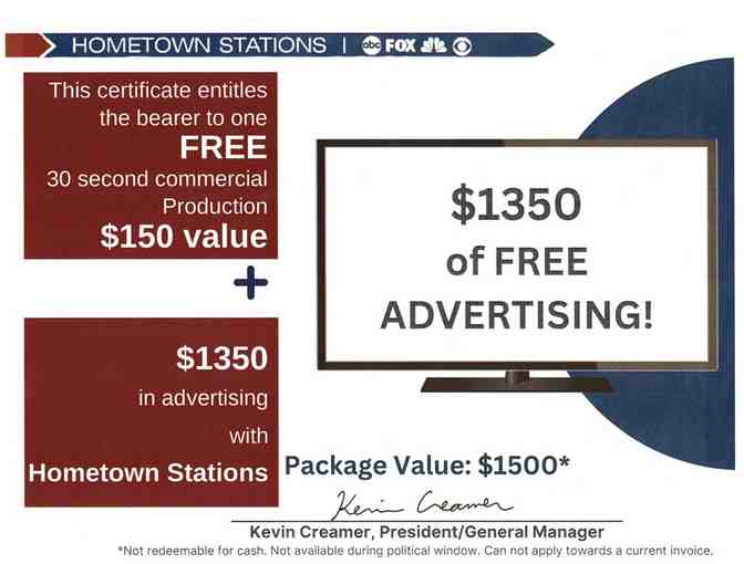 This advertising package worth $1,500 includes one FREE 30 second commerical and $1,350 in advertising with Hometown Stations.