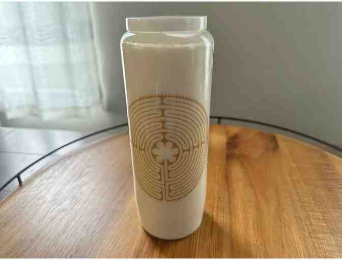 Perfect for lighting your next labyrinth walk, as the container is PLASTIC rather than easily-breakable-glass! White candle, featuring a gold Chartres Labyrinth design on the container. Comes with lid.