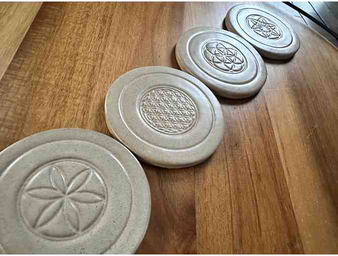 Embrace peace and balance with these awesome coasters. This set includes four unique designs: Germ of Life, Seed of Life, Flower of Life and Equilibrium of Life. Each coaster comes with felt feet to protect surfaces and is beautifully tied together with natural jute string. Perfect for gifting or adding a touch of spirituality to your own living space. Includes a card that explains each of the symbols. A Ten Thousand Villages Exclusive handcrafted in Nepal.