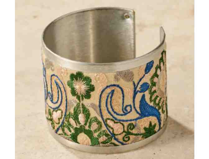 This beautiful bracelet is a unique piece that adds a touch of elegance to any outfit. The adjustable brass cuff is electroplated in brushed silver and features a stunning ribbon inlay. The delicate multi-colored silk thread embroidery makes this a versatile and luxurious accessory. A Ten Thousand Villages Exclusive handcrafted in India.