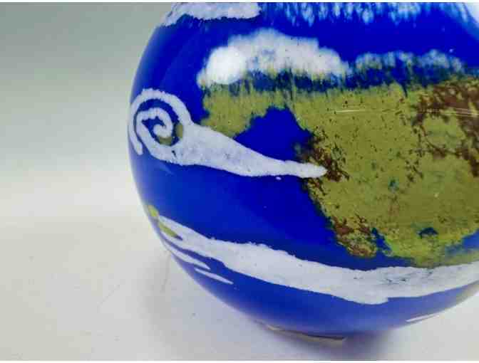 This captivating handblown glass globe captures the beauty of our planet in shimmering color and form. Deep cobalt blue oceans are adorned with continents in earthy tones of green and gold, while wisps of white clouds drift gracefully across the surface, evoking a serene, almost ethereal view of Earth from space.