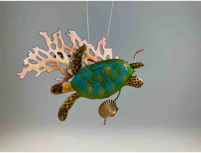 This enchanting glass and metal sculpture captures the grace and wonder of the sea turtle, a beloved symbol of longevity, navigation, and harmony with the ocean. The turtle’s detailed shell shimmers in shades of green and turquoise with intricate leaf-like patterns, while its flippers and head are delicately hand-painted with lifelike textures. Behind the turtle floats a pink coral accent, accompanied by a golden seashell, giving the piece a sense of movement and an unmistakable island charm.