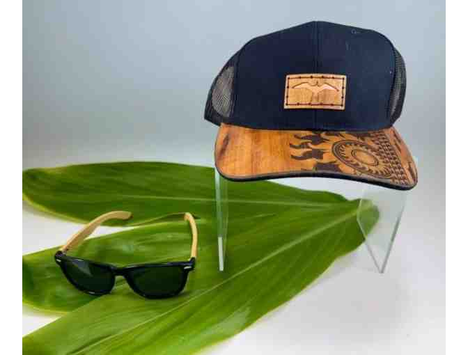 Step out in style sporting a Calabash Wearable Wood Koa Wood Hat together with Bamboo Works Ohekai Sunglasses.