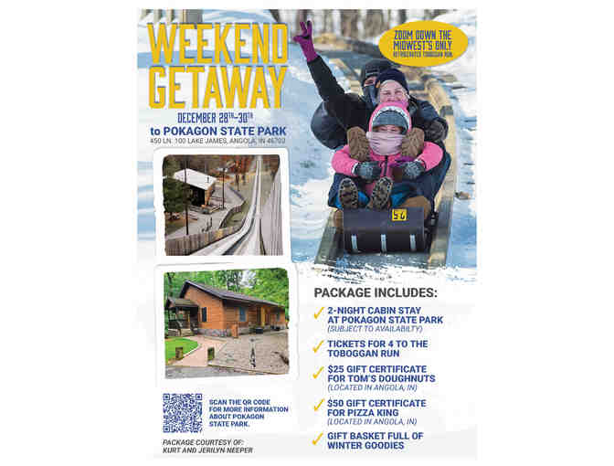 Enjoy this family get away to Pokagon State Park with tickets for 4 to the Toboggan Run! Plus gift certificates to eateries in the area and a wonderful basket of winter items!