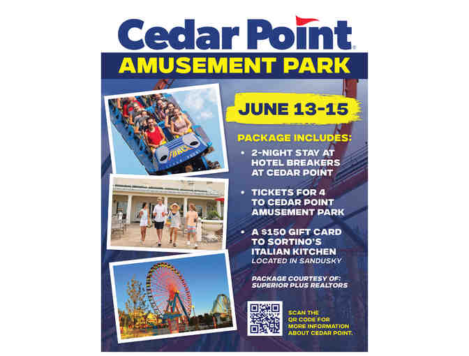 Enjoy this family trip to Cedar Point Park and Hotel Breakers June 13th-15th 2026!! This package includes: