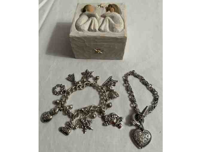 A small Willow Tree jewlery box comes with a sterling silver bracelet with a heart charm and a sterling silver bracelet with Christmas themed charms. Also included is a 2020 Willow Tree Reflections figurine.