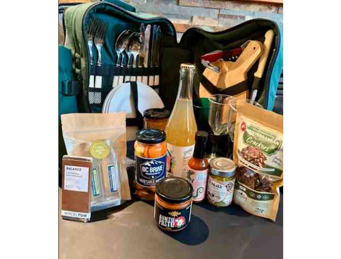 Includes Local hot sauce: Smoken Dragon; Smoked Habanero Peach hot sauce; Sunday Cider, Bacchus hard apple cider (Sun Creek Farms);Auntie Pasto, Mycelyum, Balance Milk Chocolate bar, BC Wine, Vegetable Medley, kraft pickles, Sunshine Coast Olive Oil with Apple Balsamic Vinegar, Oilala, Artichoke and Olive Pate, Purely Planted Foods, Mediterranean Crackers, and The Farm "Bourbon Apple Pie Jam.