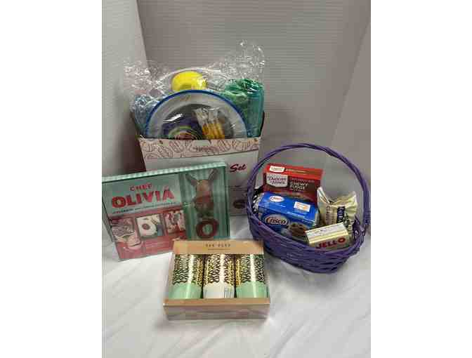 includes: Rae Dunn 60 piece baking cups, cake turntable set with measuring cups, silicone cupcake holder, whisk turntable decorating tools, chef olivia cookwbook and cookie cutter set with purple wicker basket of fudge brownies, crisco, chocolate chips and vanilla pudding.