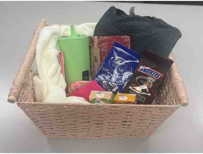This gift basket has it all! A lime green 32Oz Brumate cup, Snicker's coffee, Gourmet Chocolate, Journal for writing, Fluffy Blanket and more! A perfect basket for staying in and cuddling up to read a good book or have a movie night!